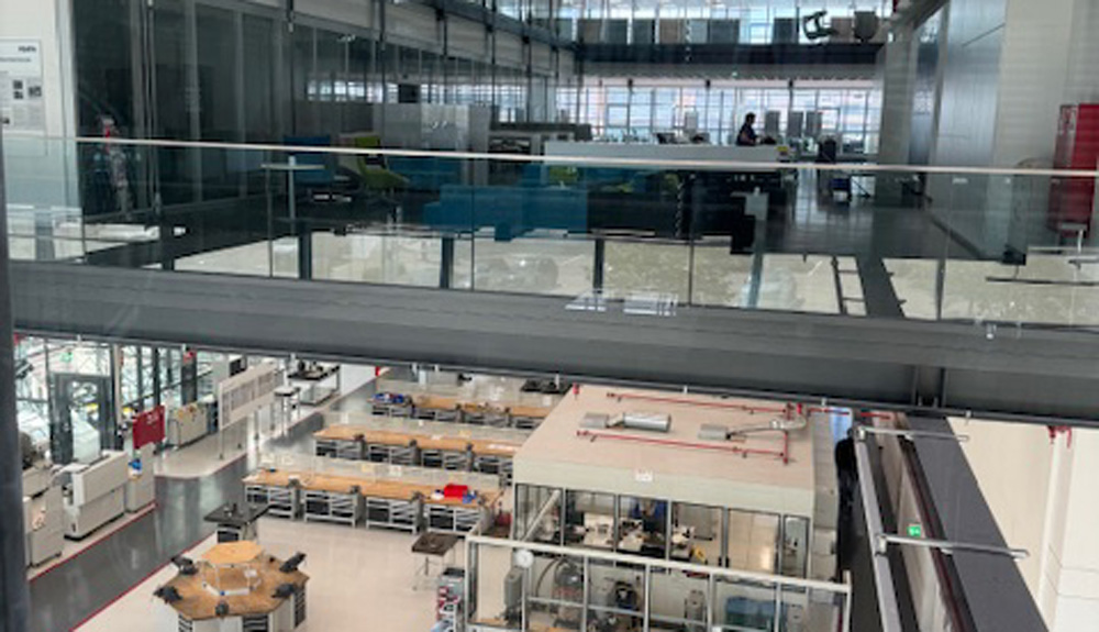Erwin Krajewski beschrieb die Intension des futuristischen Glasbaus, in dem die Ausbildung untergebracht ist. Die Glasflächen sorgen für einen außergewöhnlichen Lichteinfall, die Aufteilung der Werkstattflächen für Offenheit und Transparenz. Ein Rundgang durch das Gebäude unter der Führung von Krajewski und dem technischen Ausbildungsleiter Matthias Schlenkermann bestätigte den Besuchern die Transparenz der einzelnen Ausbildungsbereiche. Auszubildende konnten in den Abteilungen Stahlbau, Zerspanen, CAD und E-Technik bei ihren Tätigkeiten beobachtet werden. Zum Beispiel waren die Auszubildenden zum Industriemechaniker damit beschäftigt, eine Taschenlampe zusammenzubauen. Beeindruckt waren die Teilnehmer von der Präsentation einer Projektarbeit der Auszubildenden, die gemeinsam mit zwei Schülern eine alte Wasserturbine mit einem hölzernen Zahnrad repariert haben. Insgesamt werden bei Voith etwa 240 Auszubildende und Studenten ausgebildet. Als die Ausbilder gefragt wurden, welche Fähigkeiten die Schüler für eine Ausbildung mitbringen sollten, wurden die Eigenschaften „Neugierde, Kommunikationsfähigkeit und eine selbstständige Lernfähigkeit“ genannt.
