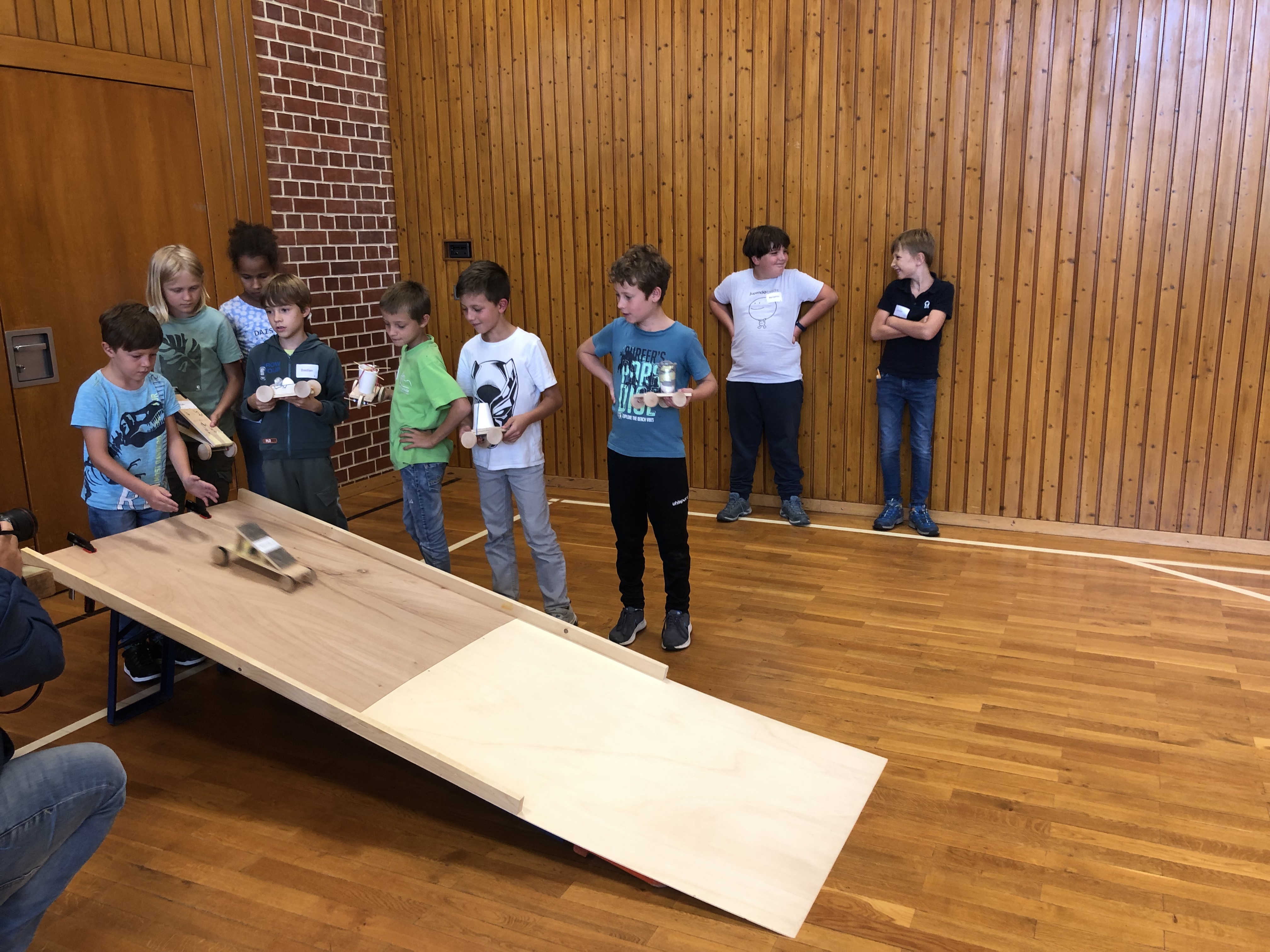- Ein Fahrzeug zu bauen, das ein Ei eine Rampe hinunterfahrend möglichst weit und heil transportiert um sich am Ende im „Egg-Race“ miteinander zu messen