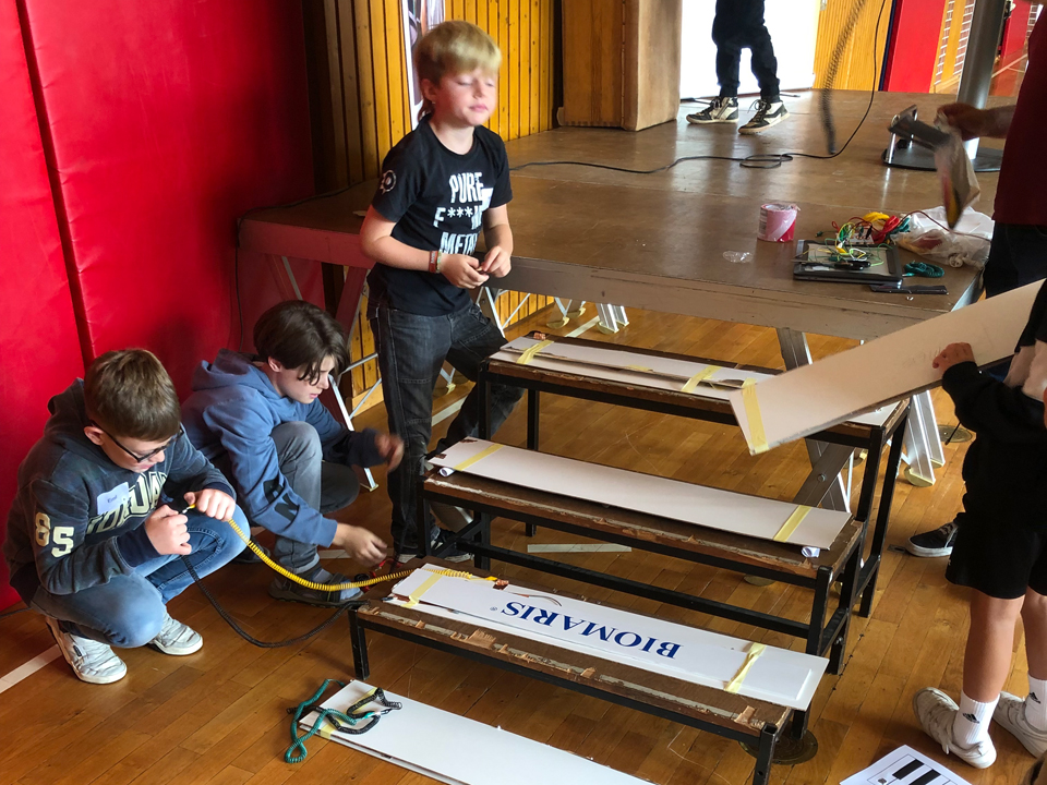 Die zweite Gruppe baute mit Schalter und Materialien aus der „TreasuRe-Box“ Treppenauflagen, die verbunden mit einem Laptop und Lautsprechern zu einem Klavier wurden. Programmiert mit „scratch“ führte so Analoges mit Digitalem verbunden zum gewünschten Erfolg. Die Treppenauflagen lockerten die sich anschließende Präsentation der Ergebnisse in der Turn- und Festhalle Weilstetten im Begehen zur kleinen Bühne hinauf „musikalisch“ auf.