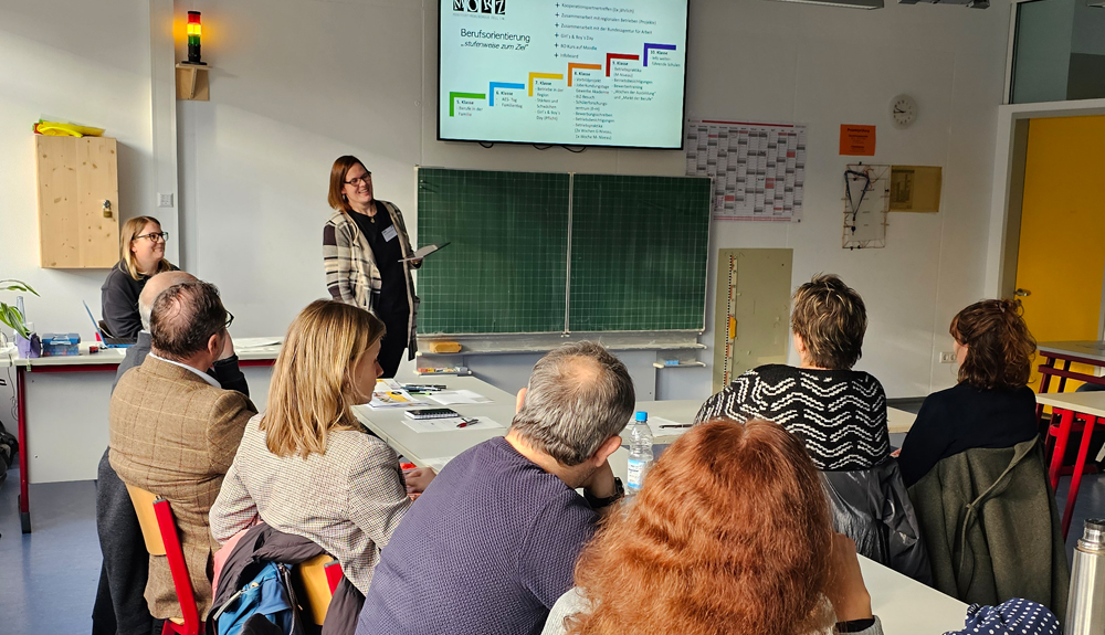 Am 14. November 2024 lud das Netzwerk SCHULEWIRTSCHAFT Lörrach in Kooperation mit der ZSL-Regionalstelle Freiburg in die Montfort-Realschule Zell i.W. ein. Im Fokus der Veranstaltung stand das Thema „Ideen zu einer gelingenden Elternarbeit und Berufsorientierung“. Das Berufsorientierungs-Team der Montfort-Realschule, Wiebke Zäh und Michaela Sidibe, präsentierte ihr erfolgreich evaluiertes BO-Konzept – ein Konzept, das 2022 erneut mit dem BORIS-Berufswahl-SIEGEL Baden-Württemberg ausgezeichnet wurde.