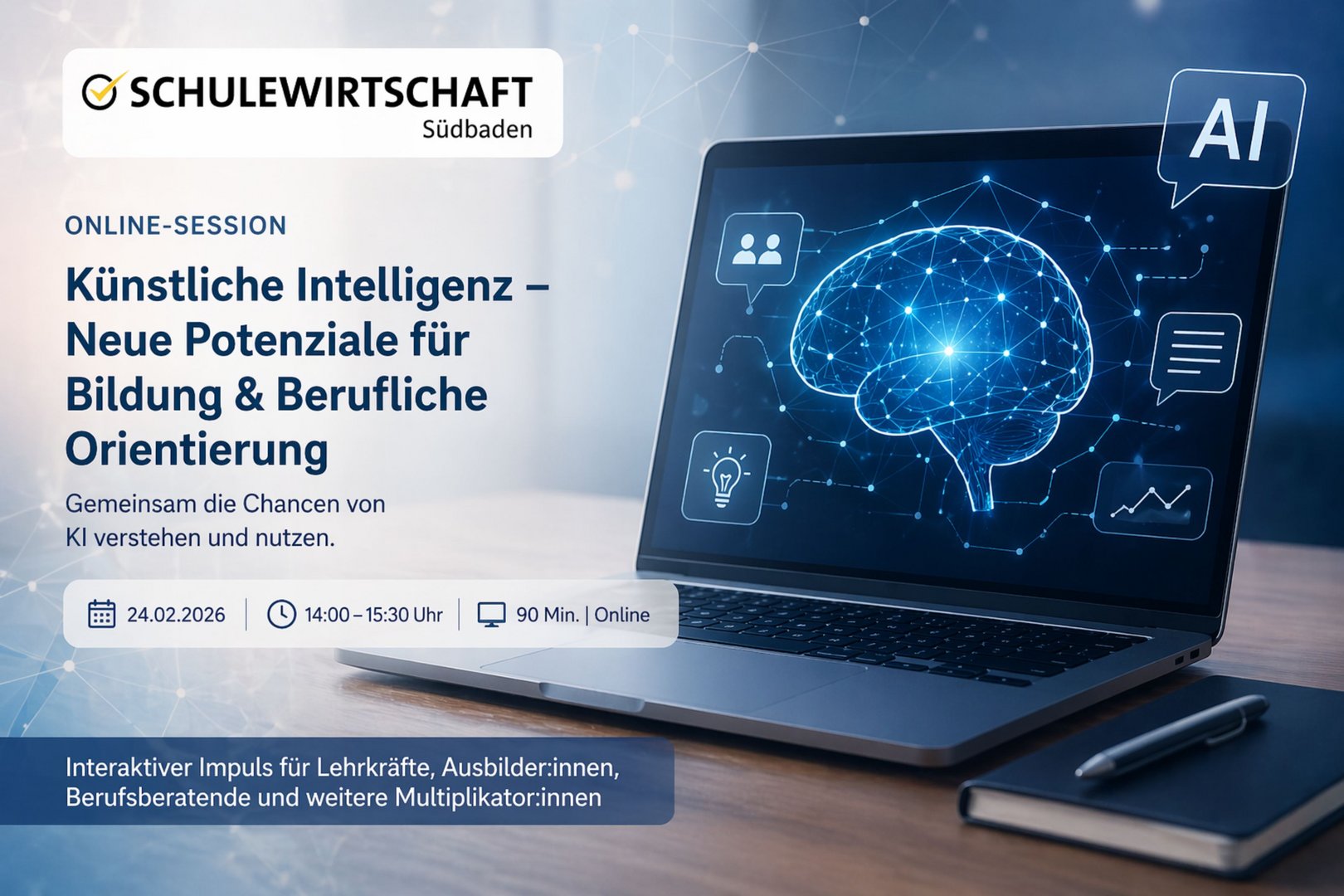 Am 24. Februar 2026 setzten die Netzwerke SCHULEWIRTSCHAFT Ortenau, Breisgau, Lörrach und Waldshut mit einer gemeinsamen Online-Session ein starkes Zeichen für zukunftsorientierte Berufsorientierung. Rund 80 Teilnehmende aus Schule, Wirtschaft und Beratung kamen digital zusammen, um sich mit den Chancen und Herausforderungen Künstlicher Intelligenz in Bildung und Arbeitswelt zu beschäftigen.