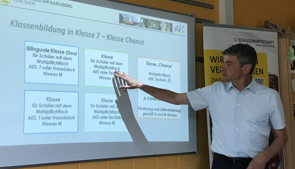 Das BO-Konzept der Realschule am Karlsberg wurde ausführlich präsentiert. Die grundlegenden Weichenstellungen dafür erläuterte Ulrich Kern als Schulleiter. Z.B. starten in dieser offenen Ganztagesschule mit 750 Schülern alle in der 5. und 6. Klasse gemeinsam in der Orientierungsstufe. Um der heterogenen Schülerschaft gerecht zu werden, findet ab der 7. Klasse folgende Klassenbildung statt. In der Klasse „Chance“ wird z.B. mit zusätzlichem Stundenumfang in den Hauptfächern und einem Klassenlehrertandem unterrichtet. Ziel ist es den Schülern, die mit einer Hauptschulempfehlung kommen gerecht zu werden. So gibt es z.B. auch eine bilinguale Klasse mit anspruchsvollen Wahlpflichtfächern. Diese Klassen bieten den Schülern mit einer Empfehlung fürs Gymnasium genügend Lernstoff um entsprechend gefördert zu werden.