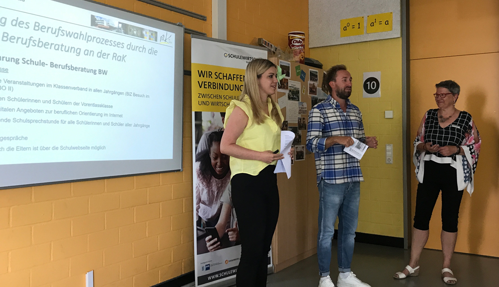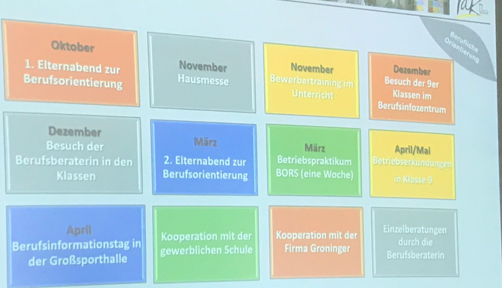 Anschließend präsentierten zwei Lehrkräfte, die für die Berufsorientierung verantwortlich sind, das BO-Konzept der RAK. Dabei spielen die Eltern sowohl in den Elternabenden als auch in der Hausmesse eine wichtige Rolle. Bei der großen Hausmesse haben die Schüler mit ihren Eltern die Chance 30 Betriebe aus der Umgebung kennenzulernen, Kontakte zu knüpfen und auch verschiedene Tätigkeiten auszuprobieren. Vier Schüler aus der 9. Klassenstufe unterstrichen in ihrem vorgeführten Rollenspiel wie hilfreich ihnen die vielfältigen BO-Angebote und der direkte Kontakt zur Berufsberaterin ist. Katharina Roeschke ist als Berufsberaterin wöchentlich einen ganzen Tag in der Schule präsent. Sie zeigte auf, dass sie nicht nur in die Klassen geht oder nur mit Termin zu sprechen ist. Ihr ist es wichtig von den Jugendlichen direkt angesprochen zu werden um konkret helfen zu können.