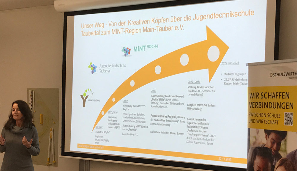 „Perspektiven erweitern: MINT-Bildung in vielfältigen Facetten“ war das Motto der Dialogveranstaltung an der DHBW Mosbach auf dem Campus Bad Mergentheim und in der Jugendtechnikschule Taubertal. Zudem waren der noch junge Verein MINT- Region Main-Tauber und das Netzwerk SCHULEWIRTSCHAFT Main-Tauber-Kreis Mitveranstalter an diesem Netzwerktreffen mit über 30 Beteiligten.