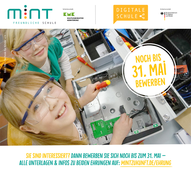 Ab Ende März bis Ende Mai ist es für Schulen wieder möglich, sich als “MINT-freundliche Schule” und / oder "Digitale Schule" zu bewerben. Die Ehrungen verstehen sich als Breitenförderung von Schulen mit einem bereits erkennbaren, grundlegenden MINT-Schwerpunkt oder digitalem Profil. Die Schulen werden für Schüler*innen, Eltern, Unternehmen sowie die Öffentlichkeit durch die Ehrung sichtbar und von der Wirtschaft anerkannt. SCHULEWIRTSCHAFT Baden-Württemberg freut sich als Partner von "MINT Zukunft schaffen!" über zahlreiche Bewerbungen aus Baden-Württemberg. Ausführliche Informationen zu beiden Auszeichnungen und zum Online-Bewerbungsprozess finden Sie hier.