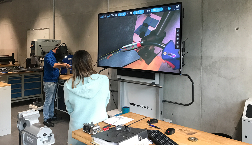 Das Schweißen wird in der ersten Lernphase mittels Hightech-Ausrüstung virtuell mit einer AR-Schweißausrüstung und einem großen Bildschirm geübt. Direkt nach der Übung wird über den Monitor das Ergebnis in verschiedenen Bereichen analysiert, ausgewertet und mit einer Gesamtpunktzahl angezeigt. Das führt unter den Azubis regelmäßig zu einer Challenge eine noch höhere Punktzahl zu erreichen und somit eine bessere Schweißnaht zu schweißen.