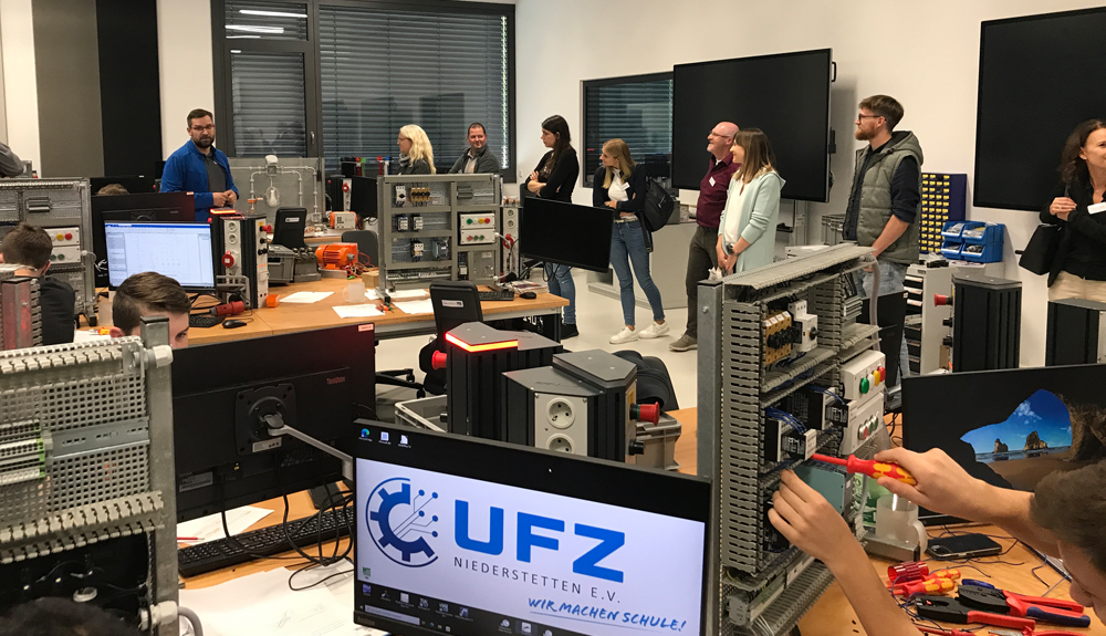 Beim Rundgang durch das neue Umschulungs- und Fortbildungszentrum UFZ Niederstetten e. V. zeigte Bernd Herschlein als Geschäftsführer wie eng verknüpft Theorie und Praxis gelehrt und praktiziert wird. So wird z.B. der Schaltplan auf dem Laptop entwickelt und als Simulation durchgespielt. Sobald alles funktioniert geht es nebenan an die Laborsteckplätze um dann direkt danach die Schaltung aufzubauen. Die zum großen Teil gemeinsam mit dem Laborausstatter entwickelten Arbeitsplätze sind gezielt auf die Bedürfnisse des UFZ ausgelegt. So leuchtet z.B. die elektrische Anlage oben rot, wenn Spannung anliegt, die für die Auszubildenden gefährlich werden könnte und grün wenn es um ungefährliche Niederspannung handelt.