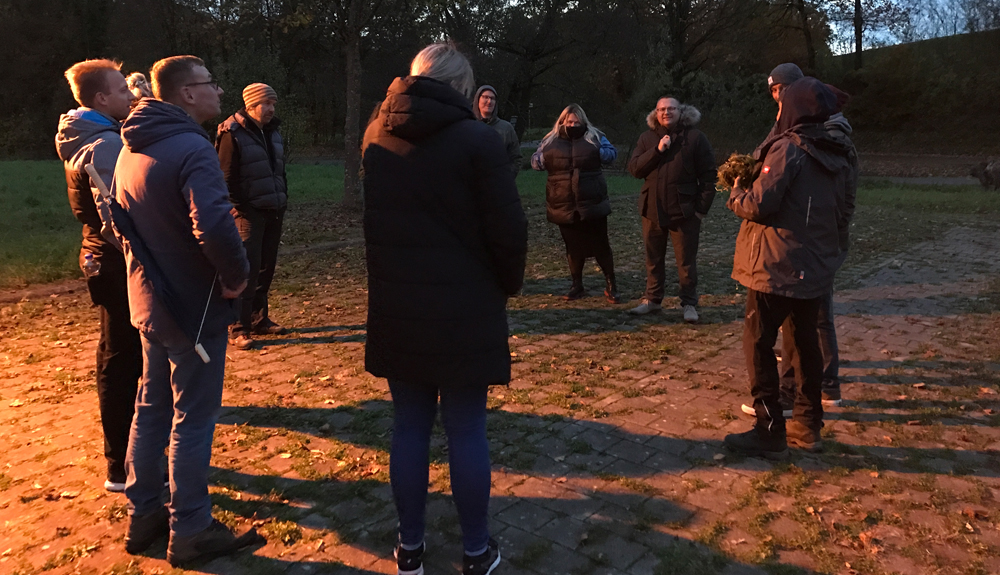 Zum Kennenlernen startete die Fortbildung am Donnerstagnachmittag mit einer erlebnispädagogischen GPS Tour durch die Gegend um Haus Steinheim, die GeoCaches brachten die Teilnehmer*innen zu einer Grillhütte, wo gemeinsam Pizza gebacken wurde.