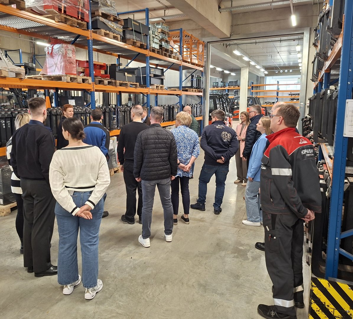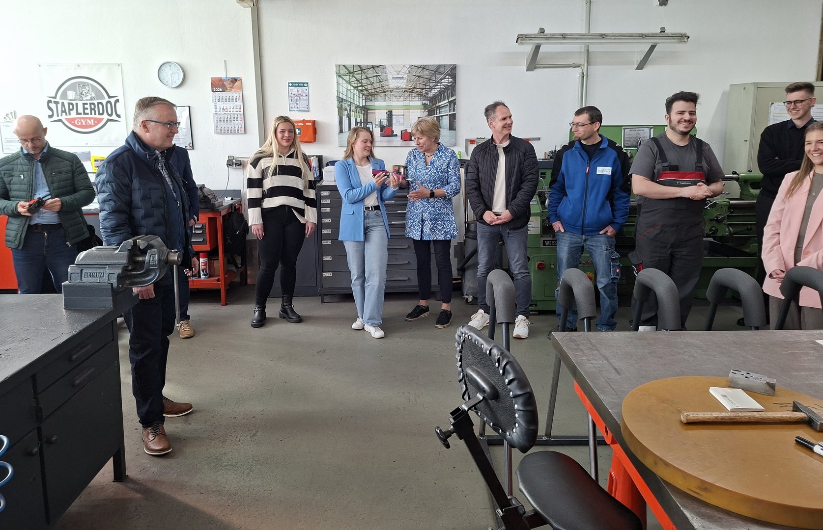 Ein Highlight der Veranstaltung war der Betriebsrundgang. Tanja Leopold führte die Gruppe durch verschiedene Hallen und gewährte authentische Einblicke in Arbeitsprozesse und Ausbildungsbereiche. Besonders beeindruckend war der Besuch der gewerblichen Ausbildungswerkstatt – dem sogenannten „Staplerdoc Gym“. Dort zeigte Thomas Stammer, Leiter der gewerblichen Ausbildung, konkrete Azubi-Projekte aus der Metallausbildung und veranschaulichte, wie praxisnah und eigenverantwortlich Auszubildende arbeiten.